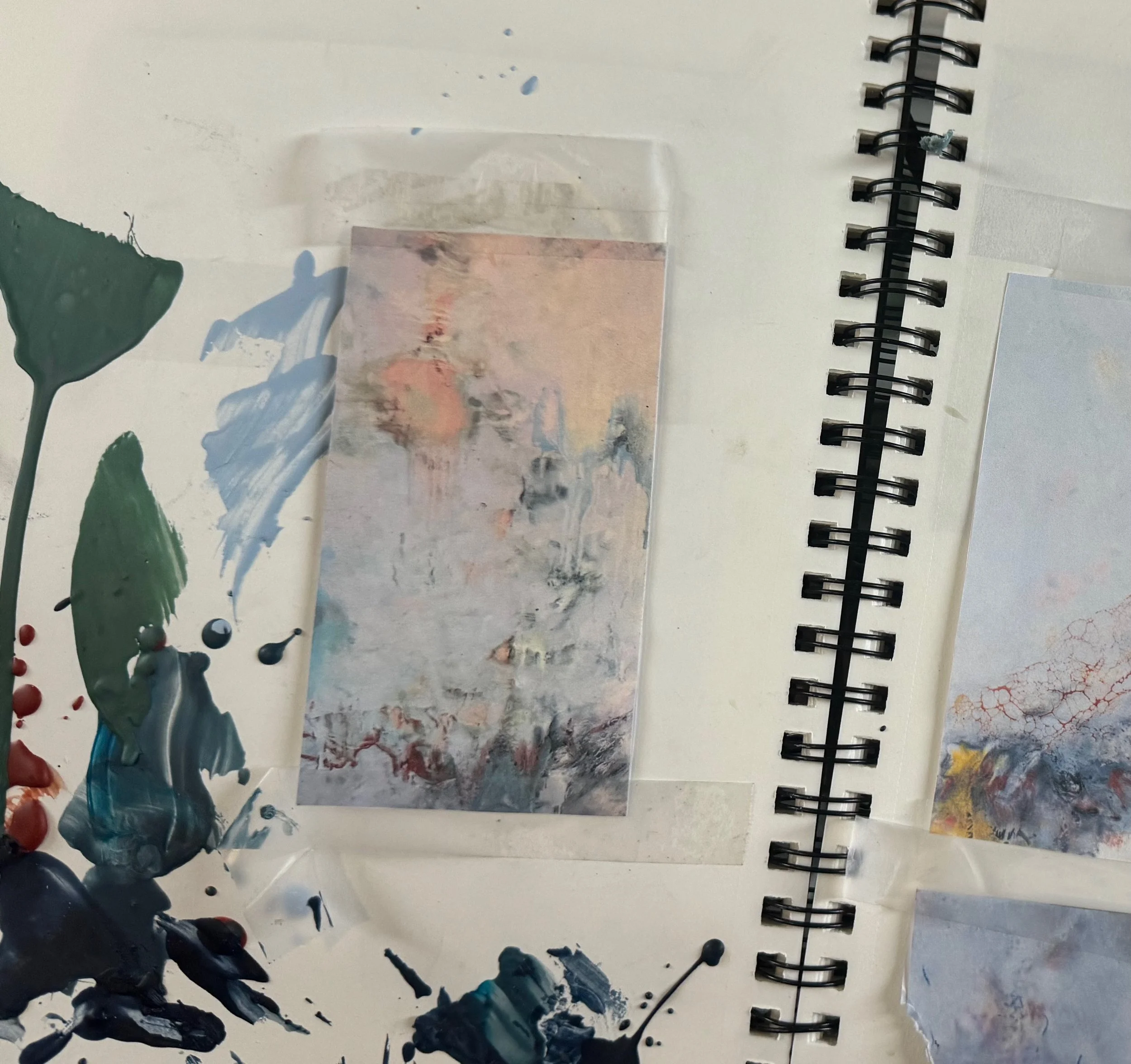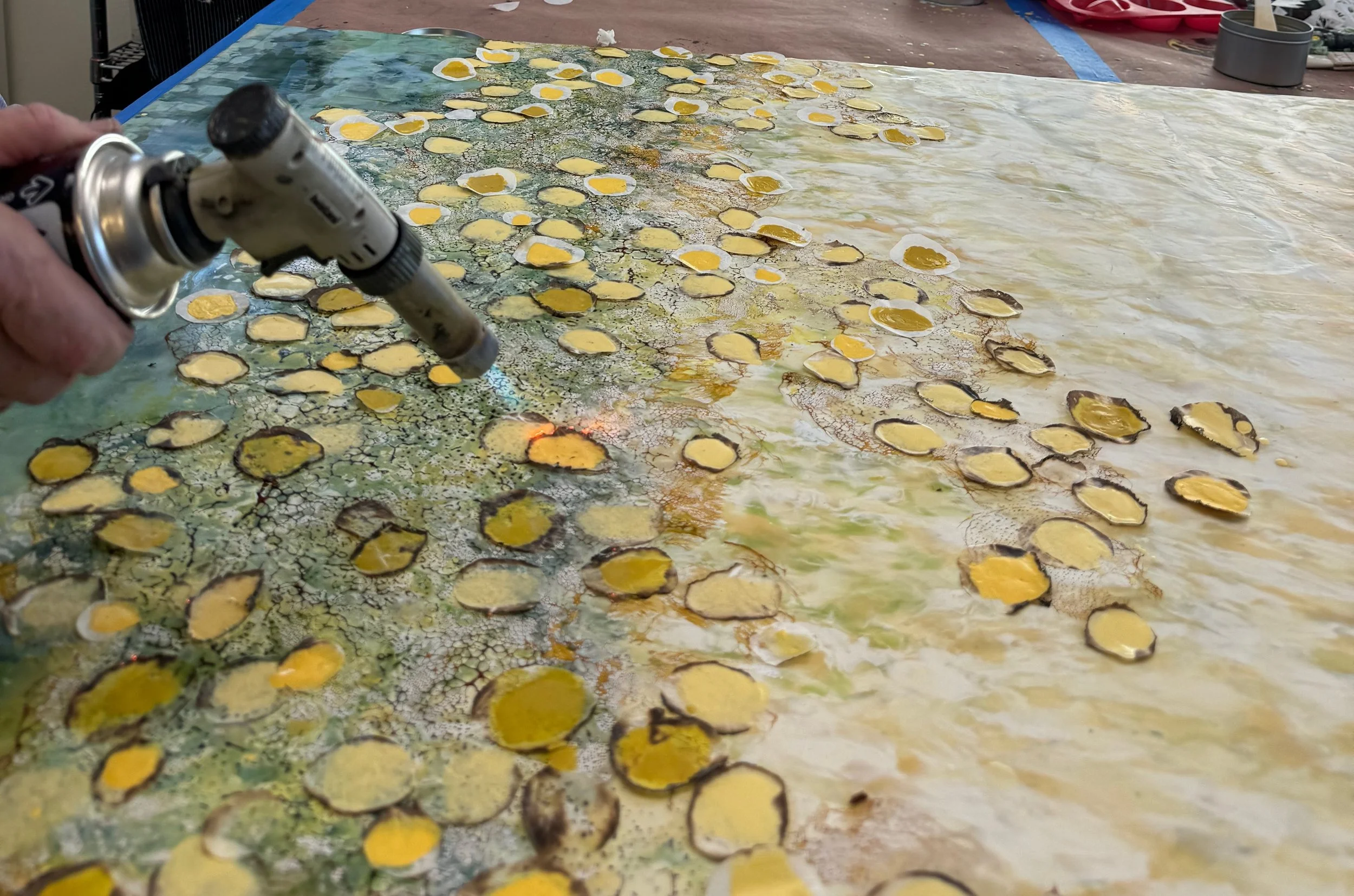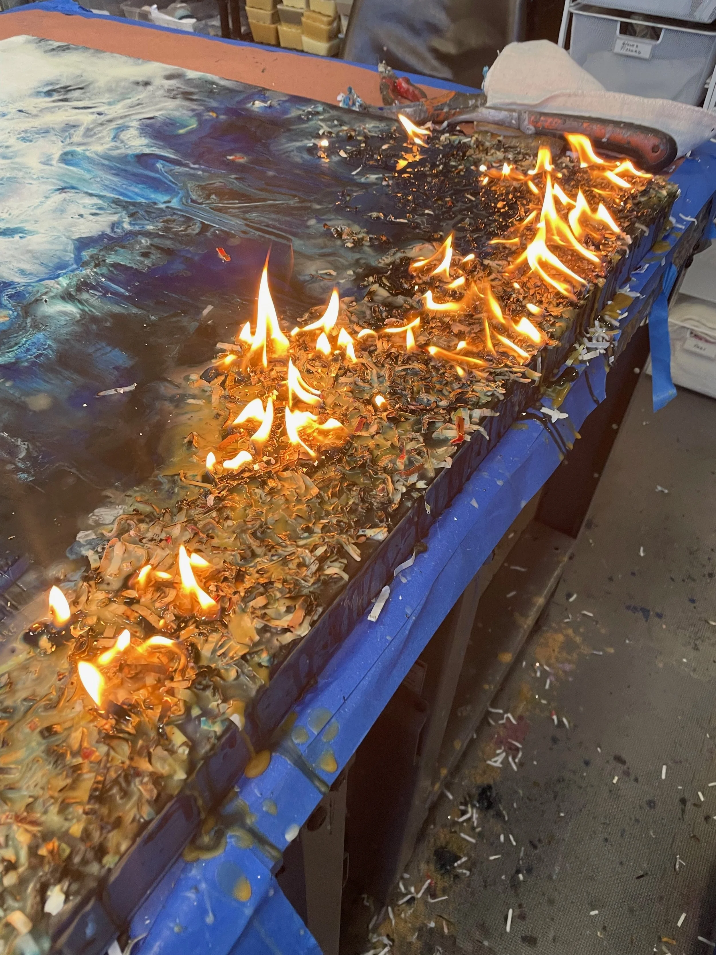 The process of encaustic painting involves hot pigment suspended in beeswax, fire and patience. I paint with a torch as well as a brush. The smell of melting beeswax pervades the studio. The painting process involves layering as many as 30 or 40 thin layers, often scraping back through them to find a color that has been laid down earlier in the process. It is not unusual for burned paper and shellac as well as objects such as pins, nails, or watch parts to find their way into one of my painting, always with the goal of using the materials to impart meaning.