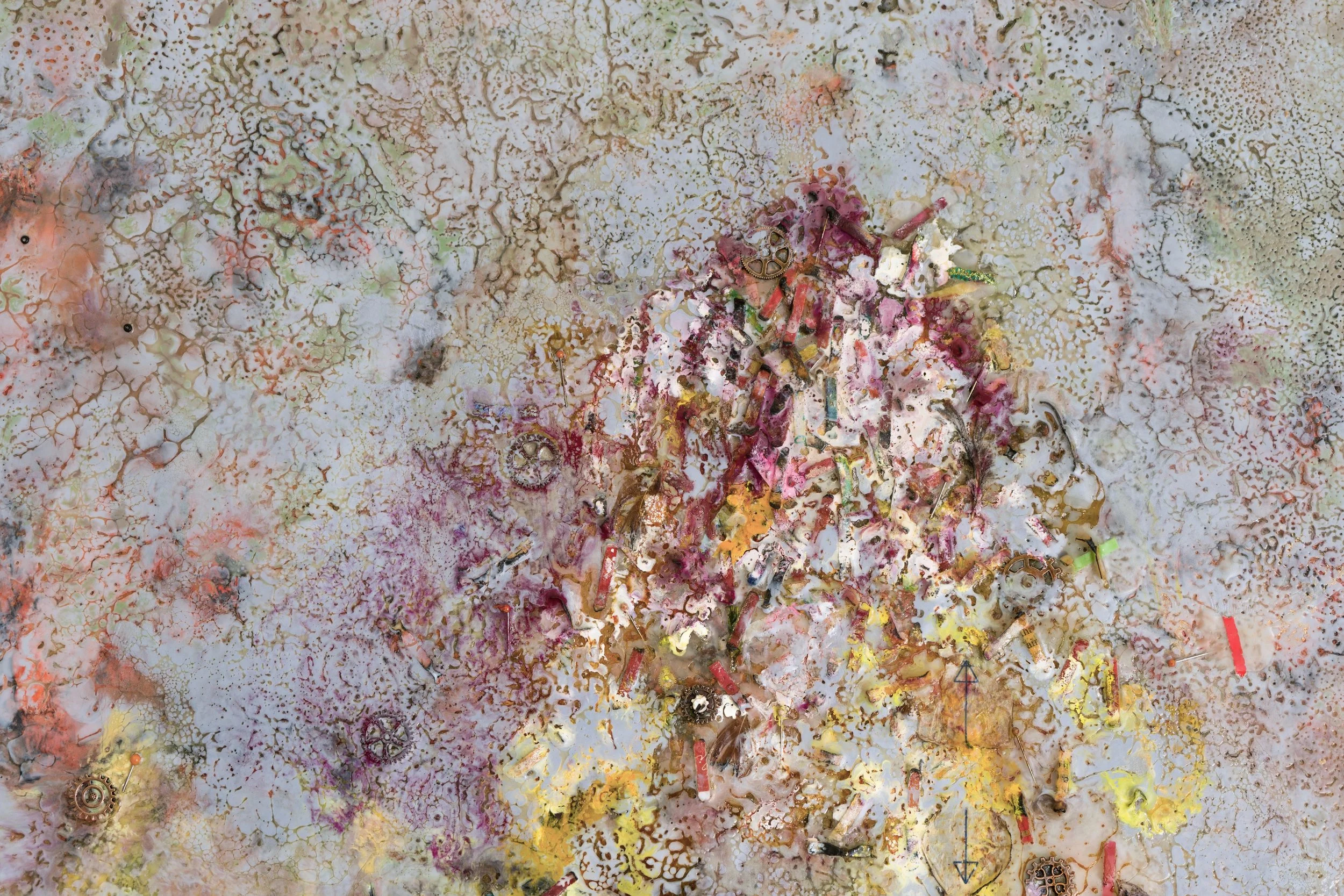 Encaustic on birch panel, shellac, graphite, oil stick, watch parts, shredded memories